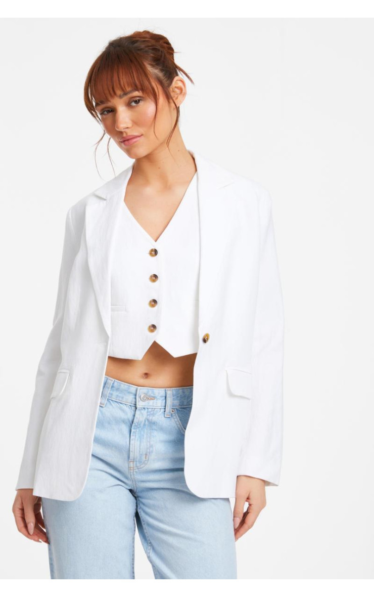 Цей білий білизний вигляд Blazer оснащений індивідуальним дизайном з декольте з екраном та довгими рукавами, що робить його придатним для повсякденних або робочих налаштувань протягом теплих сезонів.